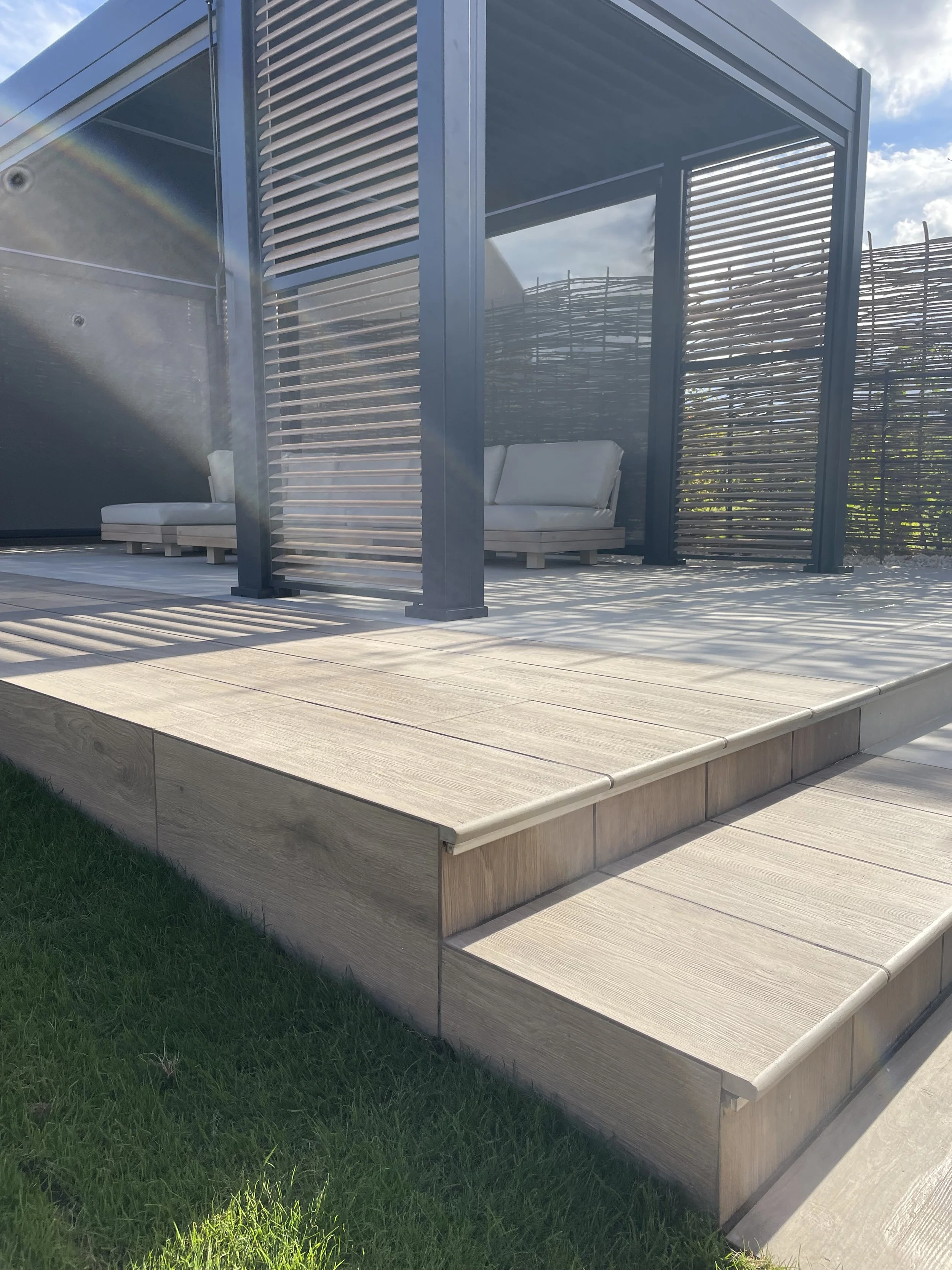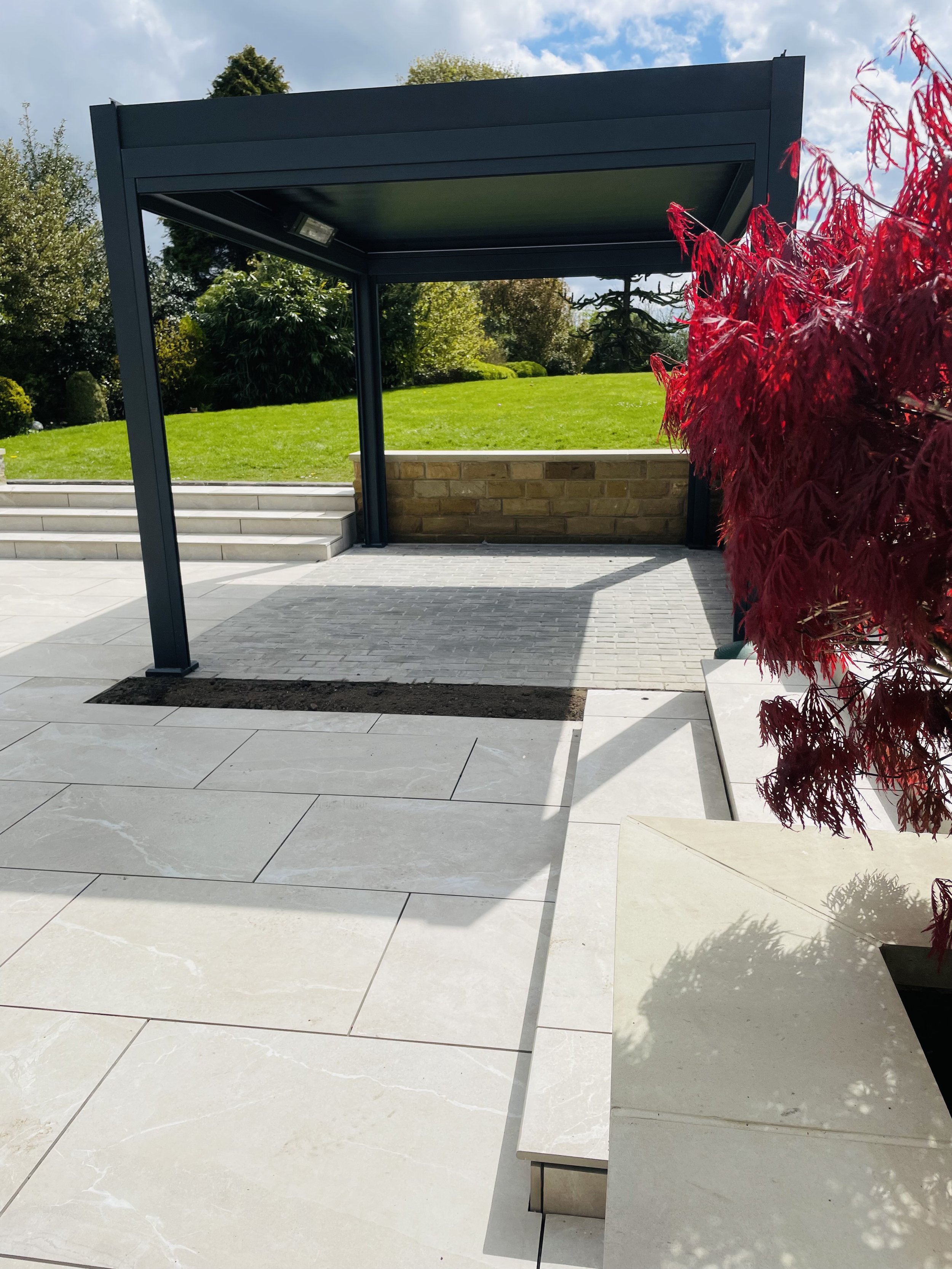 At the heart of the design, we installed a state‑of‑the‑art aluminium pergola—a striking centerpiece that creates the perfect setting for luxurious outdoor dining.